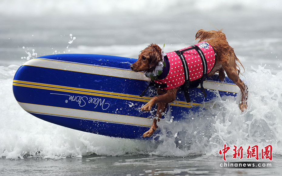 5月22日,美國加利福尼亞州圣迭戈舉行了一場妙趣橫生的狗狗沖浪比賽。圖片來源:中國新聞網(wǎng)