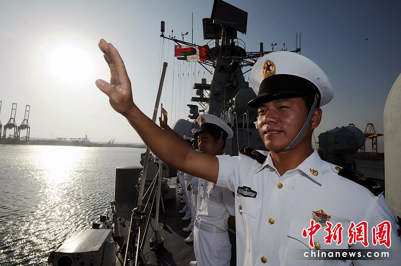 護(hù)航官兵向前來(lái)迎接的中國(guó)駐阿曼使館官員、海軍先遣組成員、中遠(yuǎn)西亞公司員工等人群揮手致意。江山 攝