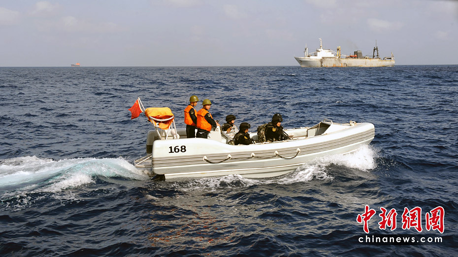 圖為特戰(zhàn)隊(duì)員從“廣州”艦換乘小艇到商船的情景。江山 攝