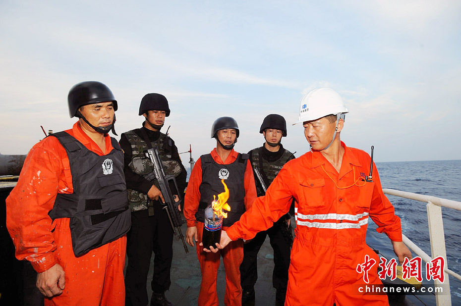 船員在特戰(zhàn)隊員的指導(dǎo)下,進行自制燃燒彈的投擲訓(xùn)練。江山 攝