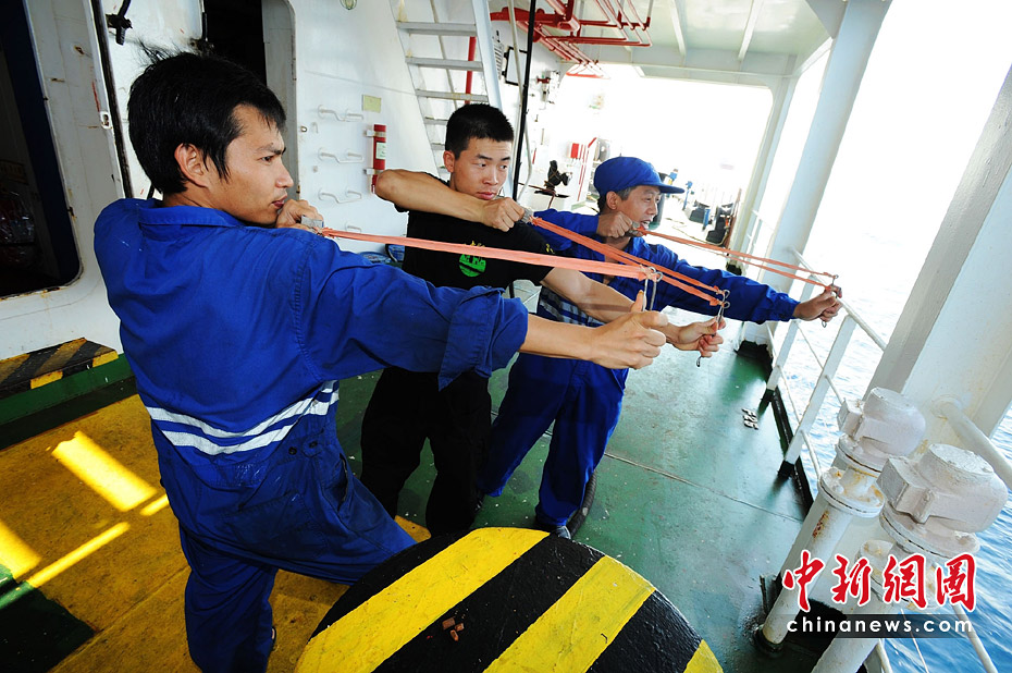特戰(zhàn)隊(duì)員杜磊(中)給船員傳授自制皮彈弓的使用技巧。該船自制皮彈弓20把,并用螺絲、彈珠和自制短鋼筋作子彈,作為防御海盜的土武器之一。江山 攝