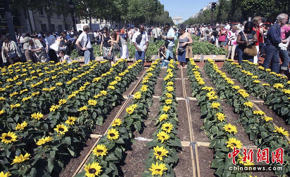 5月24日,法國(guó)總統(tǒng)薩科齊和妻子布呂尼參觀在法國(guó)巴黎舉行的“自然首都”展。該項(xiàng)展覽是由街頭藝術(shù)家加德·魏爾聯(lián)手法國(guó)“青年農(nóng)民協(xié)會(huì)”和林業(yè)協(xié)會(huì)共同發(fā)起的的,將百余種農(nóng)作物、樹(shù)木和動(dòng)物“齊聚”法國(guó)首都巴黎的香榭麗舍大街,令這條“香街”變身“綠色的自然世界”。圖片來(lái)源:中國(guó)新聞網(wǎng)