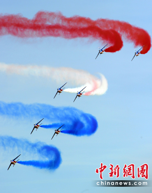5月25日,法國巡邏兵特技飛行表演隊(duì)在普羅旺斯地區(qū)進(jìn)行驚險(xiǎn)的飛行表演。