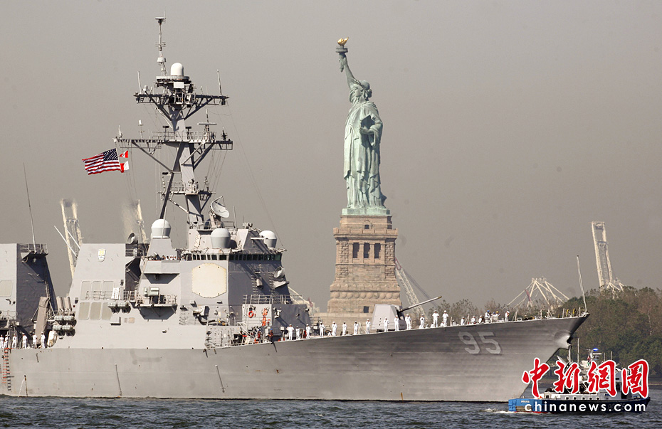 當(dāng)?shù)貢r間5月26日,美國第23屆紐約艦隊周開幕,包括“硫磺島”號兩棲攻擊艦在內(nèi)的11艘參加艦隊周活動的軍艦由南向北在哈得孫河面上游弋。紐約民眾將以?吭诼D哈得孫河86號碼頭的“無畏號”航母博物館為中心,展開為期一周的慶祝和紀(jì)念活動。圖片來源:中國新聞網(wǎng)