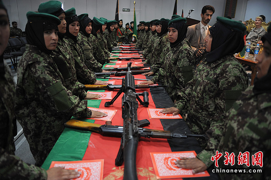 當(dāng)?shù)貢r(shí)間5月27日,阿富汗首批女軍官在首都喀布爾舉行畢業(yè)宣誓儀式。這是阿富汗軍隊(duì)征召女兵計(jì)劃的一部分,按照計(jì)劃她們將根據(jù)各自受教育程度被賦予不同的職位:接受過(guò)12年以上教育的女兵將擔(dān)任文職官;接受過(guò)9年到11年教育的將擔(dān)任軍士長(zhǎng);受教育程度更低的女兵則只能當(dāng)列兵。圖片來(lái)源:中國(guó)新聞網(wǎng)