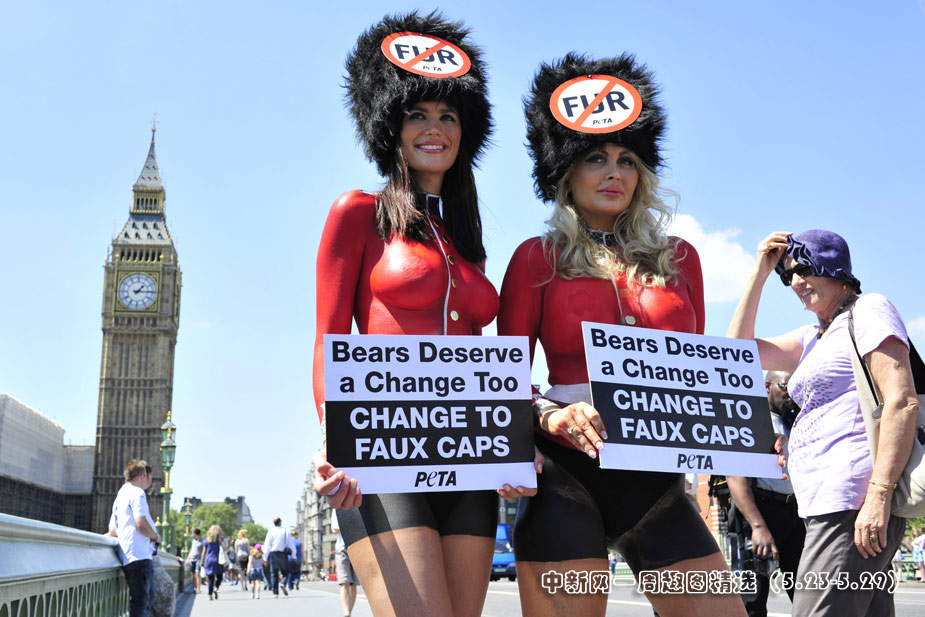 5月24日,倫敦,兩位打扮成英國女王守衛(wèi)模樣的靚模在威斯敏斯特大橋上抗議女王守衛(wèi)頭戴熊皮制作的帽子,倡議保護動物。圖片來源:中國新聞網>>點擊觀看詳細內容