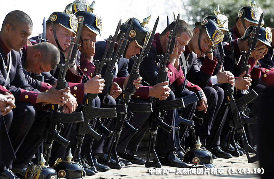 24日(周一),哥倫比亞波哥大,洪都拉斯總統(tǒng)訪問(wèn)哥倫比亞,士兵們?cè)跉g迎儀式前休息。