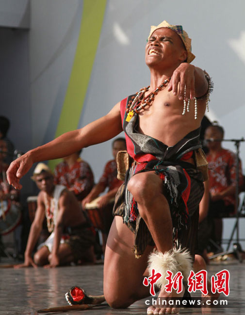5月30日,馬達(dá)加斯加肯特思米諾歌舞團(tuán)在世博園非洲廣場(chǎng)表演比洛傳統(tǒng)儀式,逼真的神態(tài)、激情的表演,博得許多參觀者稱(chēng)贊。當(dāng)天是馬達(dá)加斯加館日,世博中心內(nèi)舉行了其國(guó)家館日活動(dòng),馬方和中方代表共同出席。中新社記者 殷春永 攝