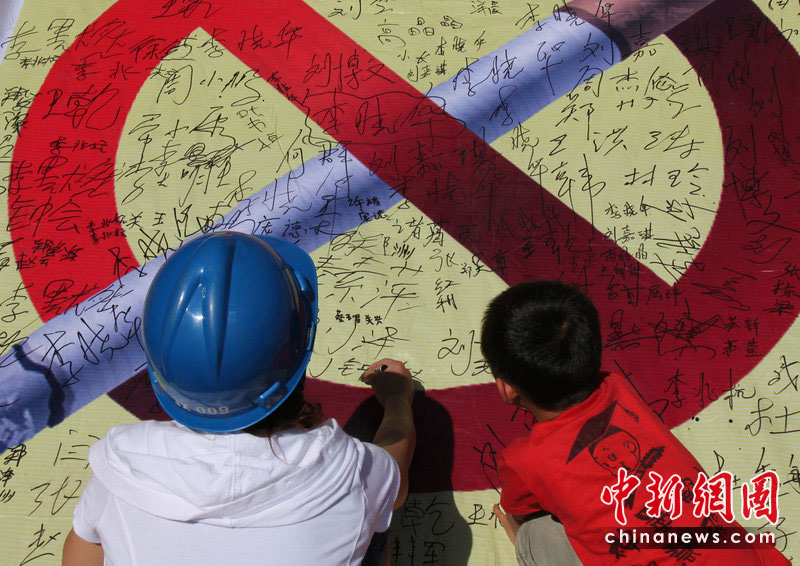 5月31日是第23個(gè)“世界無(wú)煙日”,今年的主題是:性別與煙草——抵制針對(duì)女性的市場(chǎng)營(yíng)銷。吸煙有害健康早已成為不爭(zhēng)的事實(shí)。有關(guān)醫(yī)學(xué)研究表明,吸煙可導(dǎo)致心腦血管疾病、癌癥、慢性阻塞性肺病等多種疾病,已成為繼高血壓之后的全球第二號(hào)殺手。為了您的健康,請(qǐng)熄滅您手中的香煙。圖為5月30日,河南省湯陰縣一名女電力工人和孩子一起在禁止吸煙標(biāo)志上簽名,表示要遠(yuǎn)離香煙,自覺加入控?zé)熽?duì)伍。常中正 攝