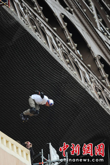 5月29日,法國巴黎,法國極限直排輪冠軍克里斯(Taig Khris)從法國艾菲爾鐵塔跳下,創(chuàng)下世界新自由落體紀錄。
