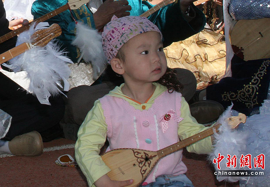 5月30日,新疆托里縣28個民族10495人共同參加冬不拉樂器表演,創(chuàng)下上海吉尼斯世界紀錄。萬人同奏的哈薩克族樂曲名為《凱乃斯》,漢語意為“和諧”。圖為參加表演的小樂手。中新社發(fā) 王小軍 攝