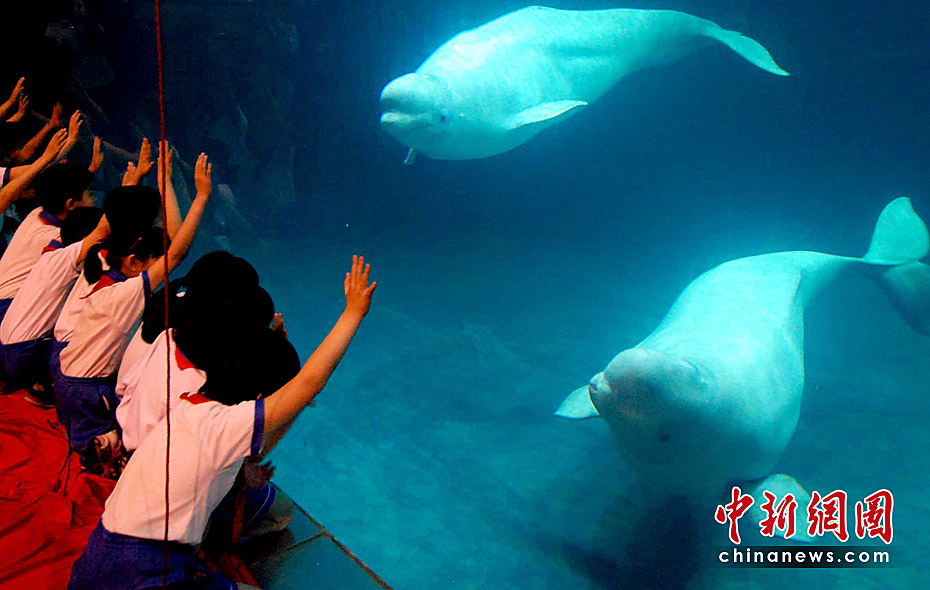 5月28日,北京海洋館從俄羅斯引進的兩頭極地白鯨首次與游客見面。同時,北京海洋館舉辦“攜手‘北極精靈’,共倡低碳生活”環(huán)保公益活動,呼吁人類應該保護海洋環(huán)境,保護珍惜物種。中新社發(fā) 張宇 攝