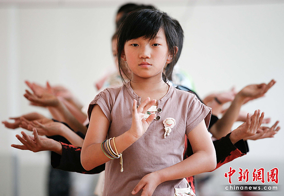 昆明市盲啞學(xué)校創(chuàng)建于1922年,是云南省第一所也是規(guī)模最大的一所特殊教育學(xué)校。學(xué)生除文化課程外,還根據(jù)學(xué)生特點(diǎn),教授學(xué)生工藝美術(shù)、推拿按摩等技能,為他們以后的生活打下了堅(jiān)實(shí)的基礎(chǔ)。圖為5月31日,在學(xué)習(xí)“千手觀音”舞蹈的學(xué)生。中新社記者 劉冉陽 攝