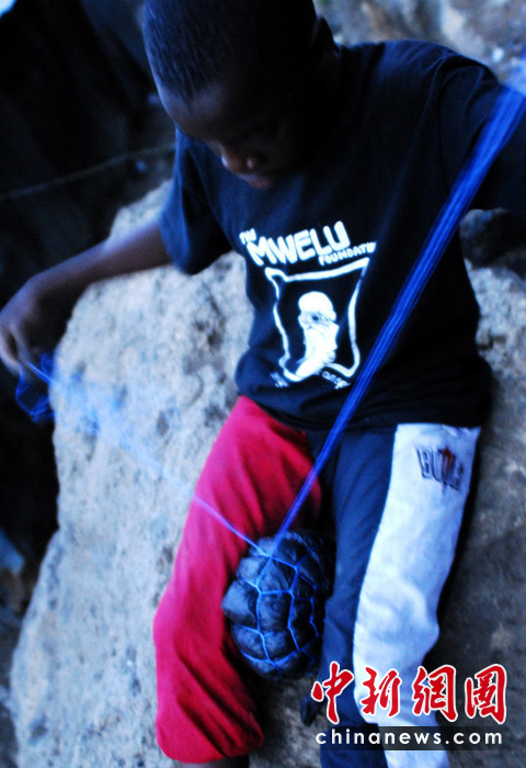生活在肯尼亞首都內(nèi)羅畢(Nairobi) Muthare難民營的小孩兒沒有能力買足球、足球鞋,更別說專業(yè)足球隊員穿的成套的球衣了。但是這些沒有給他們對足球運動的喜愛產(chǎn)生任何影響。孩子們從當(dāng)?shù)氐睦褤靵硭芰峡诖退芰纤槠,自己動手做“足球”?圖片來源:CFP