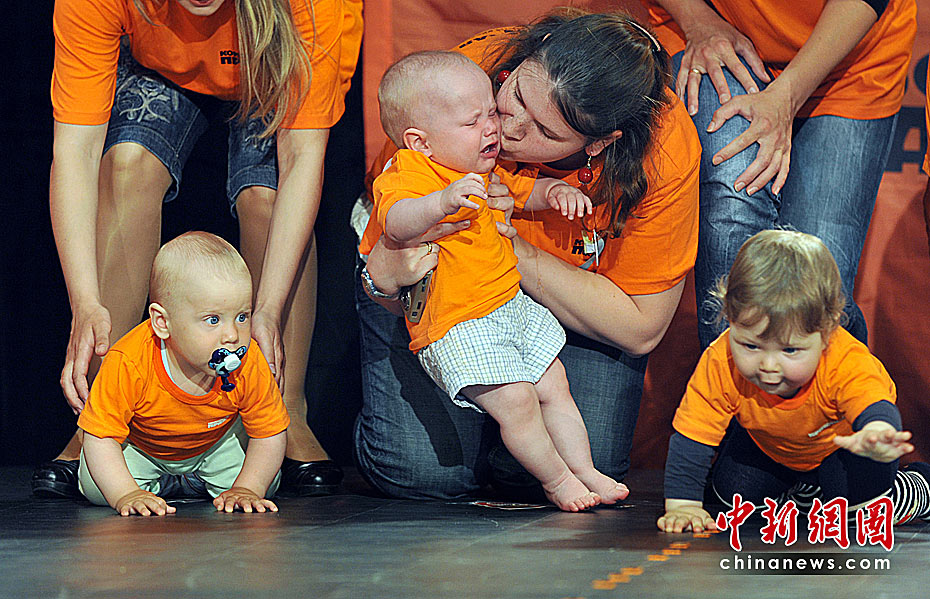 當(dāng)?shù)貢r(shí)間5月31日,烏克蘭基輔舉行了寶寶爬行大賽。數(shù)十名嬰兒在母親的鼓勵(lì)下奮力向4米外的終點(diǎn)爬去。圖片來源:中國新聞網(wǎng)