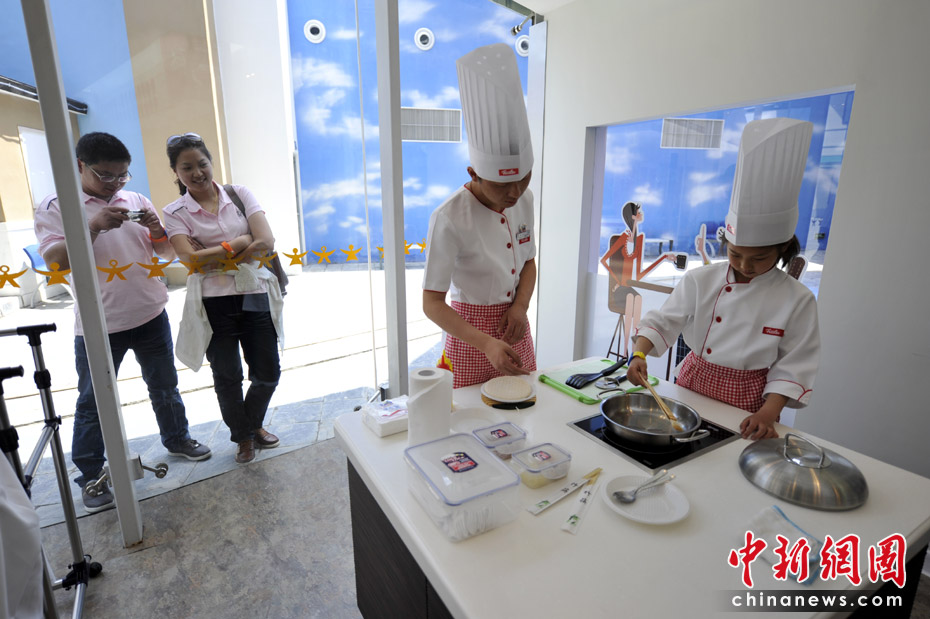 圖為孩子在體驗(yàn)廚師身份,家長在“餐廳”外為孩子加油。 中新網(wǎng)記者 王紅綱 攝