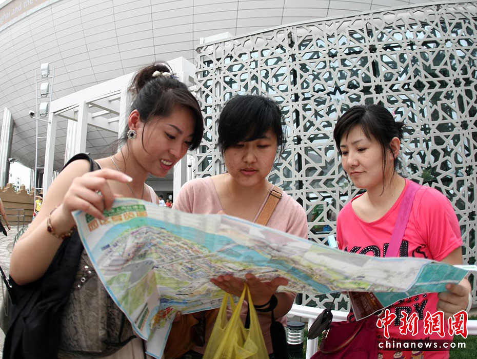 截至6月5日19點(diǎn)30分,上海世博會(huì)累計(jì)參觀者已超過(guò)1000萬(wàn)人次。據(jù)悉,上海世博會(huì)的規(guī)劃用地為5.28平方公里,約242個(gè)國(guó)家和國(guó)際組織參展分布在浦東和浦西兩大區(qū)域。要想在這么大的地方找到自己想去的地方,那么世博地圖就是必須的裝備。圖為上海世博園內(nèi)游客正在地圖上尋找自己要去的地方。中新社記者 杜洋 攝