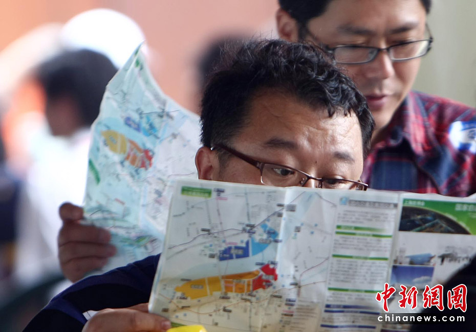 截至6月5日19點(diǎn)30分,上海世博會(huì)累計(jì)參觀者已超過(guò)1000萬(wàn)人次。據(jù)悉,上海世博會(huì)的規(guī)劃用地為5.28平方公里,約242個(gè)國(guó)家和國(guó)際組織參展分布在浦東和浦西兩大區(qū)域。要想在這么大的地方找到自己想去的地方,那么世博地圖就是必須的裝備。圖為上海世博園內(nèi)游客正在地圖上尋找自己要去的地方。中新社記者 杜洋 攝