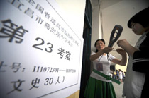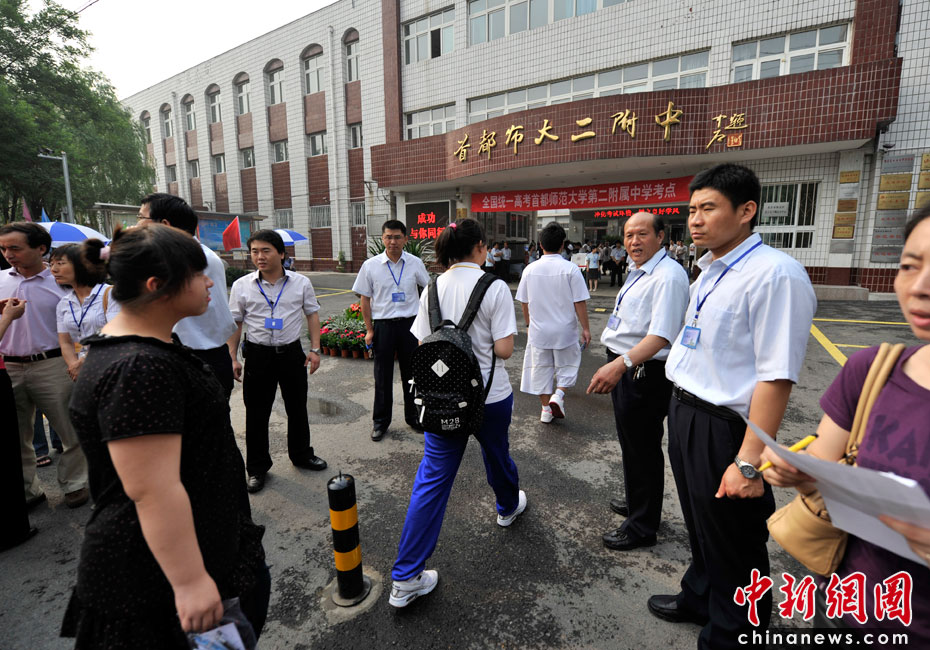 2010年全國高考6月7日日拉開大幕,957萬考生走進考場。由于報名人數(shù)減少,而招生計劃增加,教育部預計今年全國高考平均錄取率將會增加近7%。圖為首都師范大學第二附屬中學考點。中新網(wǎng)記者 金碩 攝