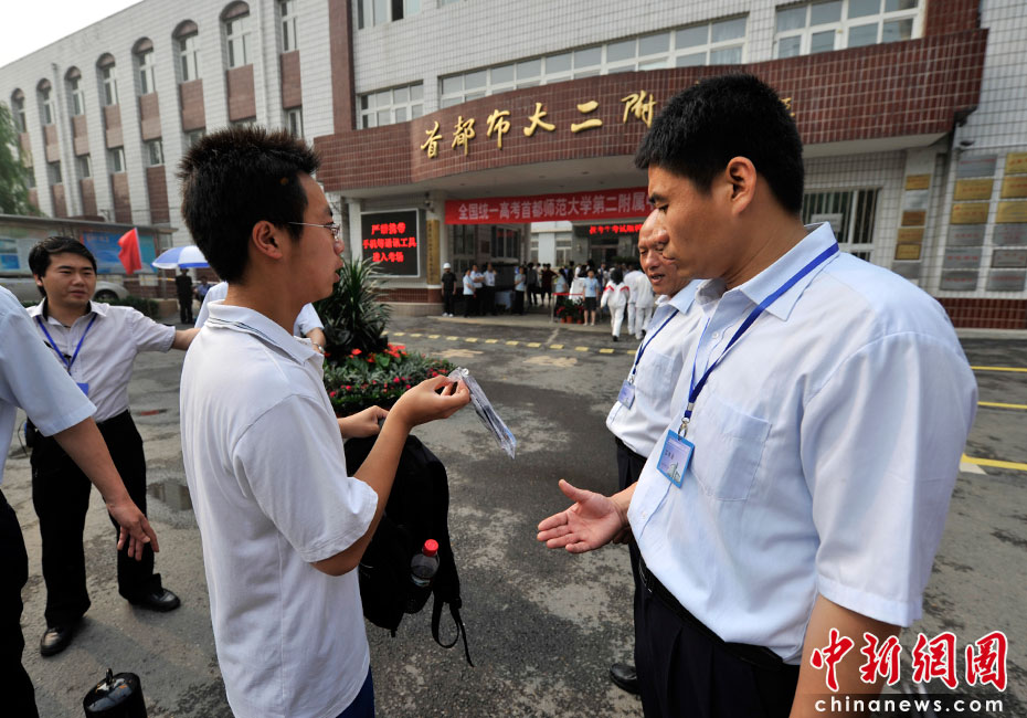 2010年全國(guó)高考6月7日日拉開大幕,957萬(wàn)考生走進(jìn)考場(chǎng)。由于報(bào)名人數(shù)減少,而招生計(jì)劃增加,教育部預(yù)計(jì)今年全國(guó)高考平均錄取率將會(huì)增加近7%。圖為首都師范大學(xué)第二附屬中學(xué)考點(diǎn)。中新網(wǎng)記者 金碩 攝