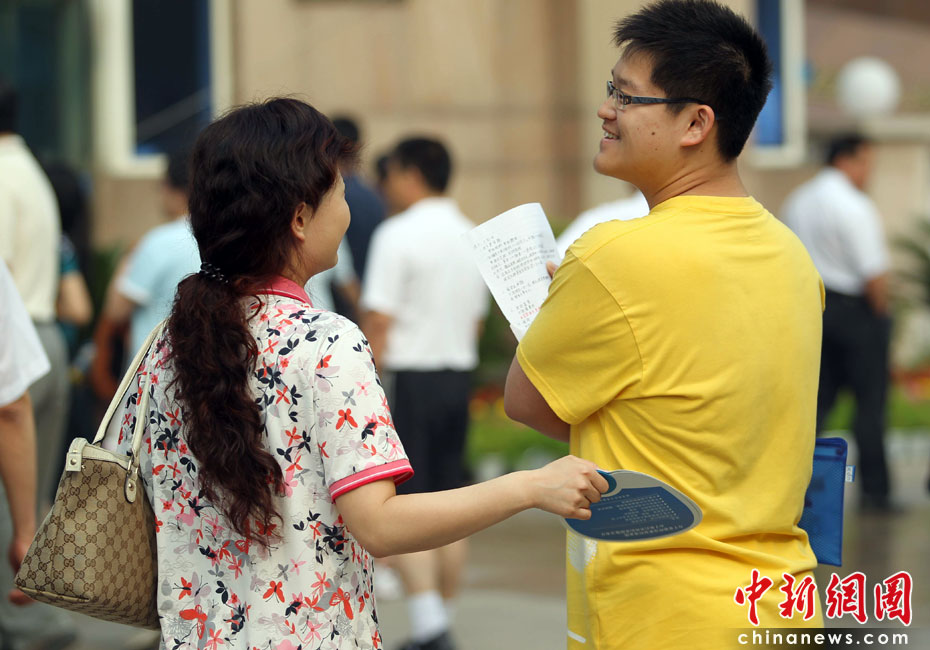 2010年全國高考6月7日日拉開大幕,957萬考生走進考場。由于報名人數(shù)減少,而招生計劃增加,教育部預計今年全國高考平均錄取率將會增加近7%。圖為母親為兒子扇風降溫。中新社發(fā) 蘇丹 攝