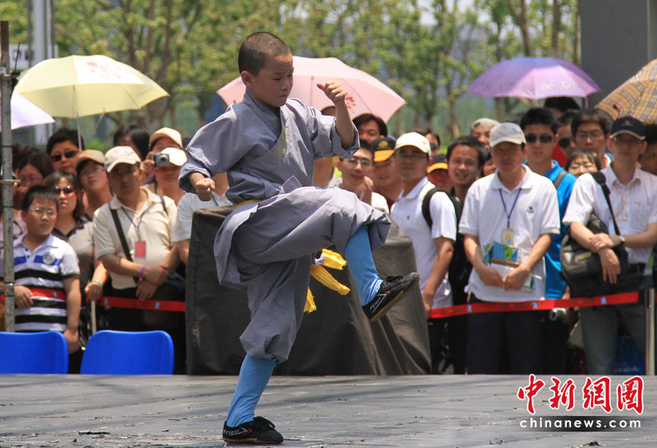 自5月1日開(kāi)始,上海世博園D片區(qū)綜藝廣場(chǎng)每天都有少林寺功夫展演,受到世博參觀者的熱捧。中新社記者 殷春永攝