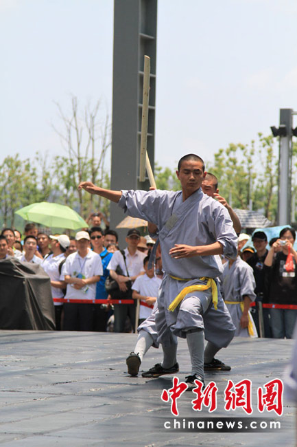 自5月1日開始,上海世博園D片區(qū)綜藝廣場每天都有少林寺功夫展演,受到世博參觀者的熱捧。中新社記者 殷春永攝