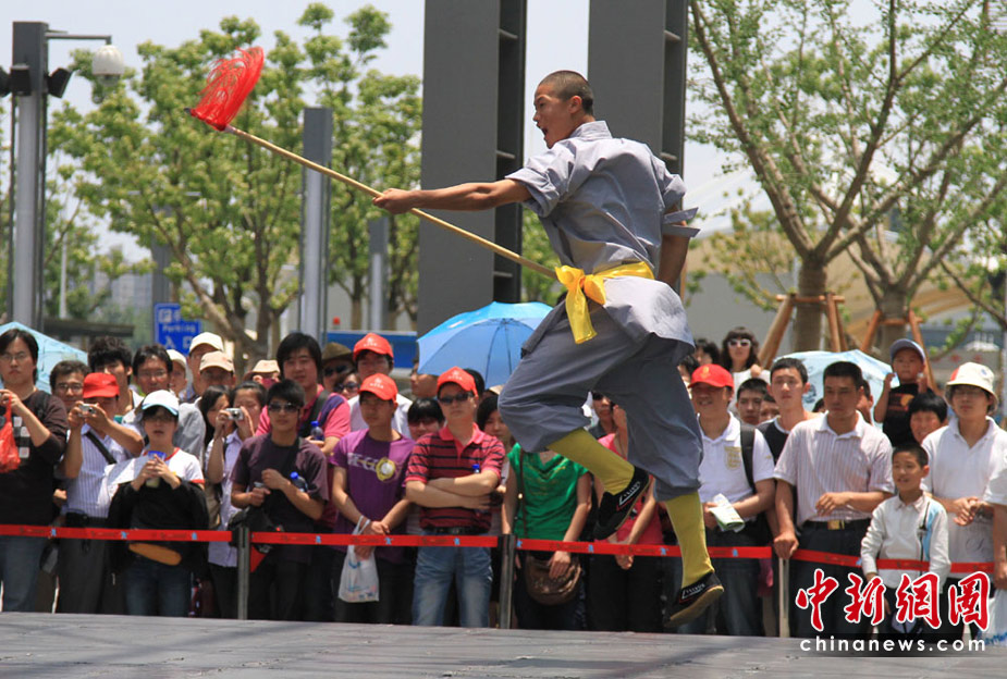 自5月1日開始,上海世博園D片區(qū)綜藝廣場每天都有少林寺功夫展演,受到世博參觀者的熱捧。中新社記者 殷春永攝