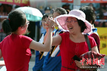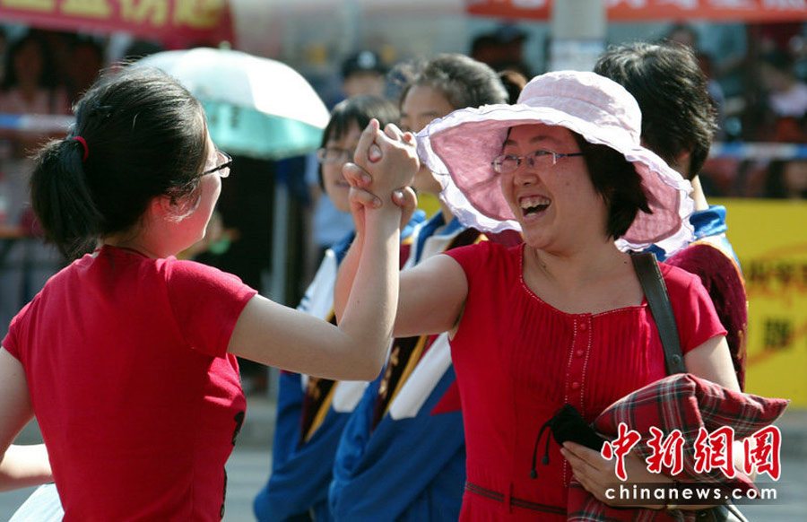 6月7日,為期兩天的2010年普通高等學(xué)校招生全國統(tǒng)一考試開考,全國將有957萬考生走進考場。圖為高考第一天,遼寧丹東一中考場外的老師鼓勵準(zhǔn)備參加考試的學(xué)生獲得好成績。陳浩 攝