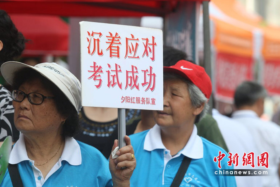 6月7日,為期兩天的2010年普通高等學(xué)校招生全國統(tǒng)一考試開考,全國將有957萬考生走進考場。圖為在哈爾濱一考點外,夕陽紅服務(wù)隊的老人舉起牌子鼓勵考生。小剛 攝