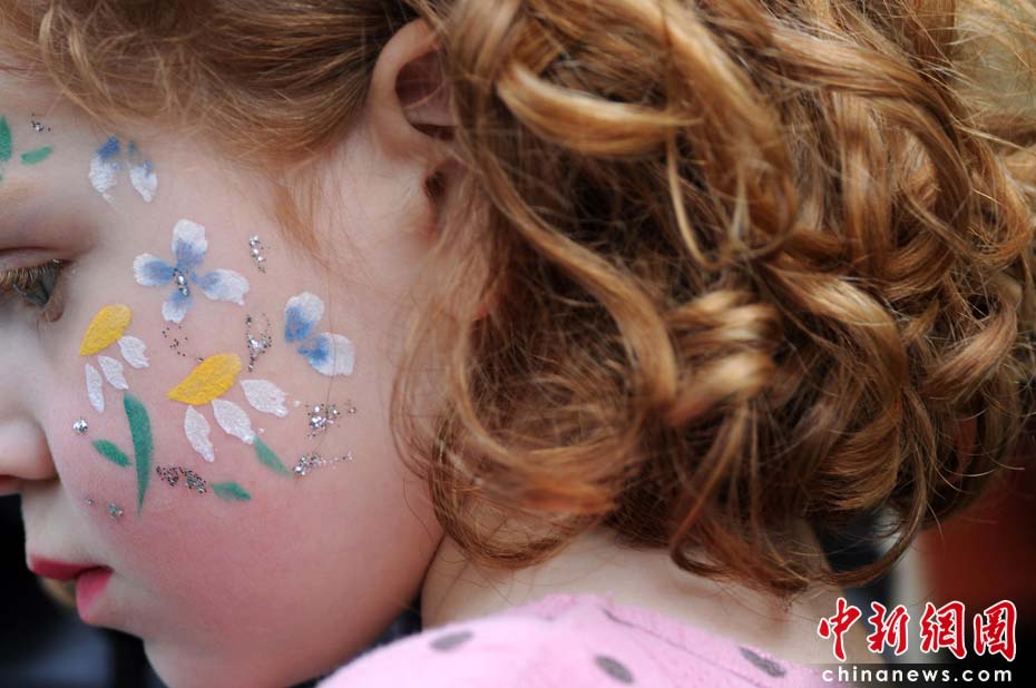當(dāng)?shù)貢r(shí)間2010年6月6日,英國倫敦舉行卡姆登綠色市集(Camden Green Fair),這是英國倫敦每年環(huán)保領(lǐng)域的“重頭戲”。本屆市集的主旨是要喚起大眾對(duì)環(huán)境問題的關(guān)注,選擇更加可持續(xù)發(fā)展的生活方式。據(jù)活動(dòng)主辦方預(yù)計(jì),本屆市集將吸引來自英國各地和世界各國的2萬多人參加。圖為可愛的英國小女孩兒臉上的環(huán)保圖案。Fiona/攝 Fiona 馬小剛/文