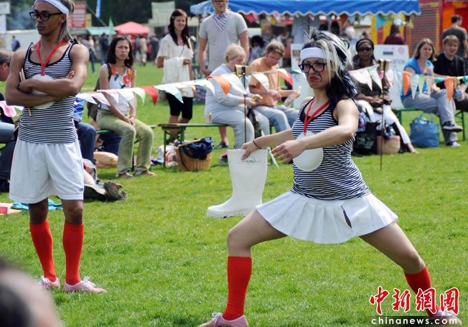 當(dāng)?shù)貢r(shí)間2010年6月6日,英國倫敦舉行卡姆登綠色市集(Camden Green Fair),這是英國倫敦每年環(huán)保領(lǐng)域的“重頭戲”。本屆市集的主旨是要喚起大眾對(duì)環(huán)境問題的關(guān)注,選擇更加可持續(xù)發(fā)展的生活方式。據(jù)活動(dòng)主辦方預(yù)計(jì),本屆市集將吸引來自英國各地和世界各國的2萬多人參加。圖為活動(dòng)志愿者組織大家玩兒傳統(tǒng)的夏季游戲“扔靴賽”。Fiona/攝 Fiona 馬小剛/文