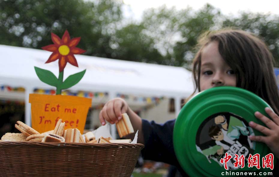 當(dāng)?shù)貢r間2010年6月6日,英國倫敦舉行卡姆登綠色市集(Camden Green Fair),這是英國倫敦每年環(huán)保領(lǐng)域的“重頭戲”。本屆市集的主旨是要喚起大眾對環(huán)境問題的關(guān)注,選擇更加可持續(xù)發(fā)展的生活方式。據(jù)活動主辦方預(yù)計,本屆市集將吸引來自英國各地和世界各國的2萬多人參加。圖為免費的素點心深受小朋友喜愛。Fiona/攝 Fiona 馬小剛/文