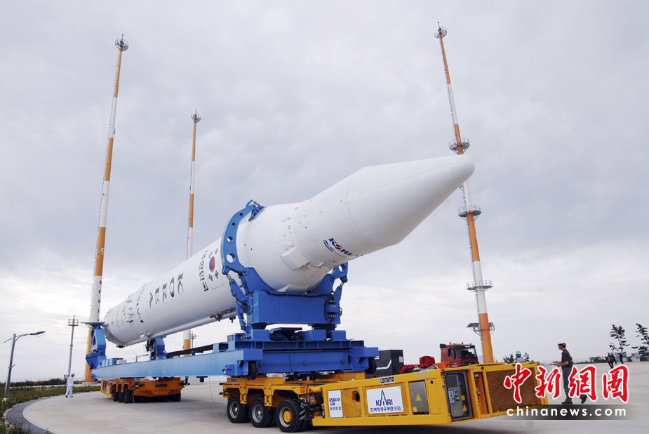 韓國首枚運載火箭“羅老”號6月9日將再次發(fā)射升空。羅老號曾于去年8月25日第一次發(fā)射升空,但由于衛(wèi)星保護整流罩未能分離,最終未能進入正常軌道。圖為6月7日,韓國“羅老”號運載火箭運往全羅南道羅老航天中心。