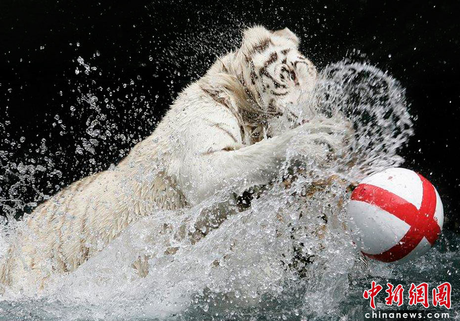 2010年6月7日,美國南卡羅來納州美特爾海灘,在世界杯即將開幕之際,一歲的小白虎Sundaram和孟加拉虎Mukti率先在水里上演了一出足球大戲。英格蘭隊首戰(zhàn)將對陣美國隊,因此足球外側(cè)也被印上了英格蘭旗的標(biāo)志。cfp