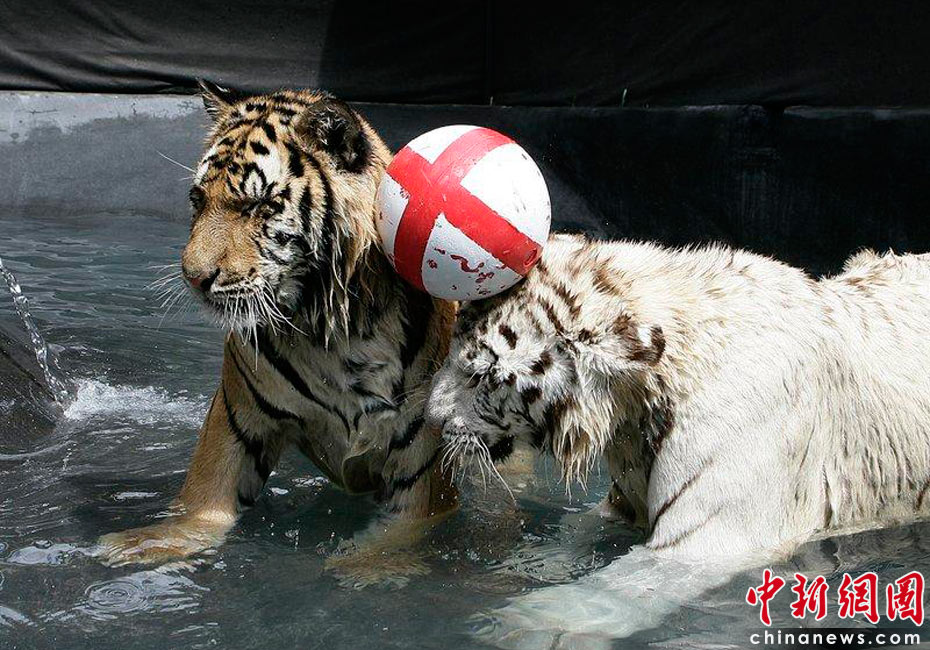 2010年6月7日,美國南卡羅來納州美特爾海灘,在世界杯即將開幕之際,一歲的小白虎Sundaram和孟加拉虎Mukti率先在水里上演了一出足球大戲。英格蘭隊(duì)首戰(zhàn)將對(duì)陣美國隊(duì),因此足球外側(cè)也被印上了英格蘭旗的標(biāo)志。cfp