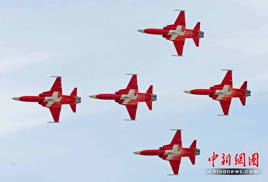 2010年柏林國(guó)際航空展于當(dāng)?shù)貢r(shí)間6月8日在德國(guó)柏林舍內(nèi)費(fèi)爾德機(jī)場(chǎng)開(kāi)幕。9日,瑞士飛行表演隊(duì)在航展上演了精彩的飛行表演。圖片來(lái)源:中國(guó)新聞網(wǎng)