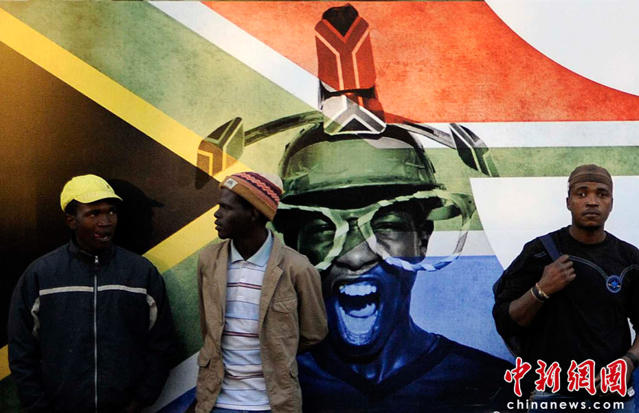 當地時間6月9日,民眾在南非約翰內斯堡街頭的世界杯宣傳畫前,非洲大陸即將首次迎來足球世界杯。中新社發(fā) 廖攀 攝