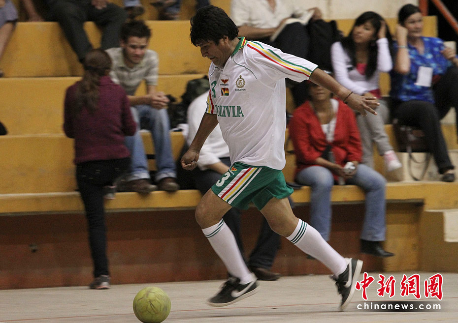 圖為2009年11月1日,玻利維亞總統(tǒng)莫拉萊斯當日在拉巴斯代表玻利維亞總統(tǒng)隊和巴西大使館隊踢了一場足球比賽。結(jié)果玻利維亞總統(tǒng)隊以10-2的比分獲勝。