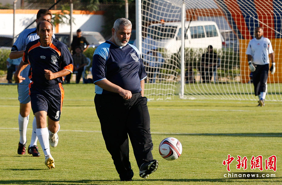 圖為2009年8月7日,加沙,巴勒斯坦伊斯蘭抵抗運(yùn)動(dòng)(哈馬斯)領(lǐng)導(dǎo)人哈尼亞在雅穆克體育場重新開放的儀式上大秀足球球技。