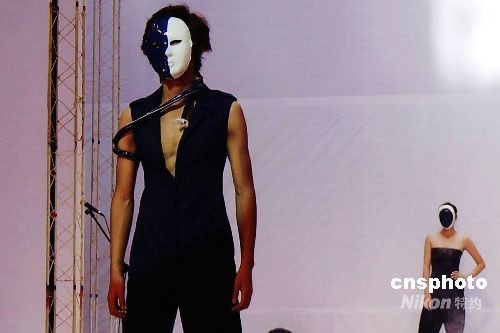 圖為戴面具的模特展示上海大學(xué)巴黎國際時裝藝術(shù)學(xué)院的原創(chuàng)服飾。據(jù)悉,該作品靈感來源于被壓抑的現(xiàn)代都市人。中新社發(fā) 孟幻 攝