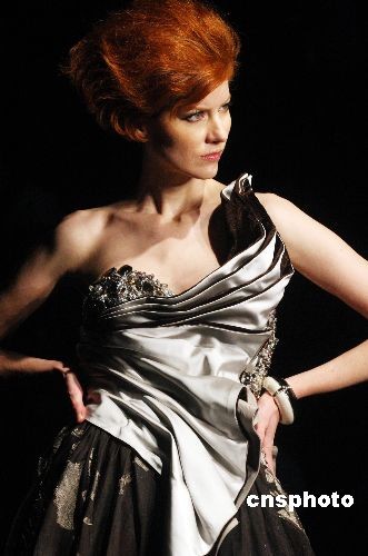 11月11日,北京中國國際時裝周2009春夏系列發(fā)布會推出董懷光高級時裝,創(chuàng)意來源于百年奧運,以奧運主體建筑結(jié)構(gòu)的完美與大氣,將宏大的盛況和千年文化底蘊及建筑優(yōu)美的幾何立體元素融入到設(shè)計構(gòu)思中。圖為模特展示董懷光高級時裝發(fā)布會作品。中新社發(fā) 錢興強 攝