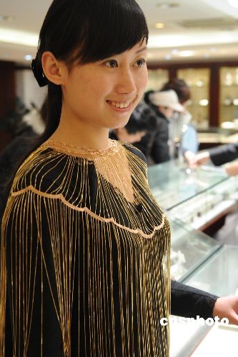 3月10日,在濟(jì)南泉城路一家金店,店員向顧客展示一款價(jià)值29.8萬(wàn)元的金質(zhì)披肩。據(jù)店方介紹,這款披肩在國(guó)內(nèi)首度亮相,采用18k金機(jī)織而成,設(shè)計(jì)獨(dú)特,十足珍貴。中新社發(fā) 羅波 攝