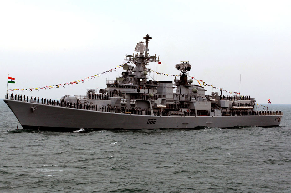 中國(guó)歷史上的首次多國(guó)海軍檢閱活動(dòng)四月二十三日下午在青島附近黃海海域舉行。中國(guó)國(guó)家主席、中央軍委主席胡錦濤乘閱兵艦“石家莊”號(hào)導(dǎo)彈驅(qū)逐艦,檢閱中國(guó)海軍的潛艇、水面艦艇、海軍航空兵和海軍陸戰(zhàn)隊(duì)等作戰(zhàn)兵種,并檢閱了來(lái)訪(fǎng)的十四個(gè)國(guó)家的二十一艘艦艇。圖為參加檢閱的印度海軍“孟買(mǎi)”號(hào)導(dǎo)彈驅(qū)逐艦。中新社發(fā) 宋吉河 攝