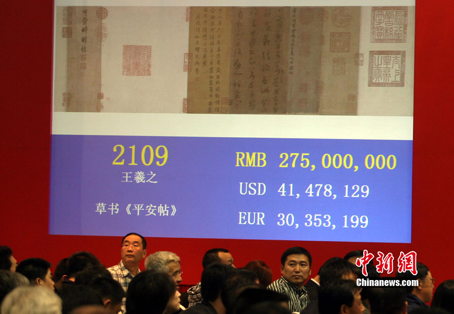 11月20日晚,在中國(guó)嘉德2010秋季拍賣會(huì)“秋光萬(wàn)華——清代宮廷藝術(shù)集粹”專場(chǎng)中,王羲之草書(shū)《平安帖》以人民幣三億零八百萬(wàn)成交。中新社 楊可佳 攝