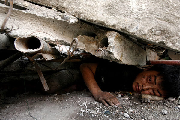 2008年5月15日,在四川省北川縣城的廢墟下,26歲的男子陳堅在等待援救。晚上8時,經(jīng)過7個鐘頭的營救他被救出,但由于傷勢嚴(yán)重沒能活下來。作者:郭鐵流 中國