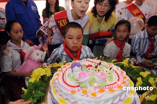 5月29日,來自四川青川縣喬莊鎮(zhèn)的李新婷在鄭州骨科醫(yī)院病房?jī)?nèi)過十一歲生日,醫(yī)護(hù)人員、熱心市民為這位來自四川災(zāi)區(qū)的小傷員送上了生日蛋糕、小書包等禮物。中新社發(fā) 李志全 攝