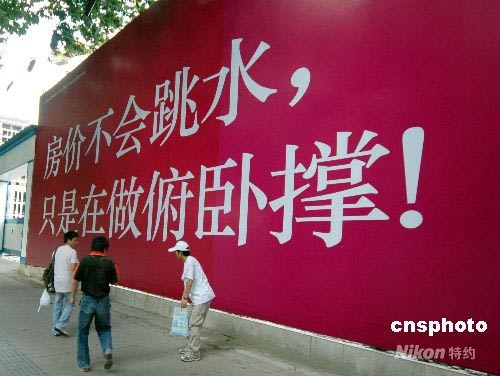 圖為房地產(chǎn)開發(fā)商在南京街頭打出的廣告牌。最近網(wǎng)絡(luò)上流行“我是出來做俯臥撐的”這句話,而南京某開放商也想借機(jī)炒作一把,在南京新街口附近立起一塊廣告牌“房?jī)r(jià)不會(huì)跳水,只是在做俯臥撐”。中新社發(fā) willis84 攝