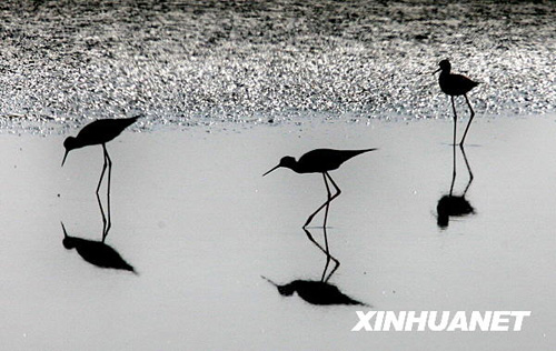 近日,上萬只黑翅長腳鷸飛臨山西運城鹽湖,它們或嬉戲或覓食,為秋日鹽湖增添了一道美麗的風景。