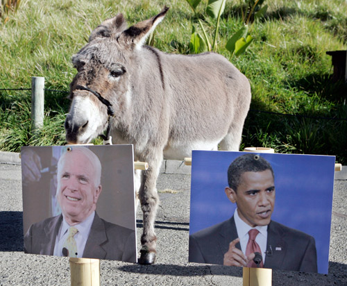有好事者29日在加利福尼亞做了一個有趣的試驗。讓一頭驢和一頭大象投票。令人意想不到的是,象征著民主黨的驢選擇了麥凱恩,而象征共和黨的大象卻選擇了奧巴馬。